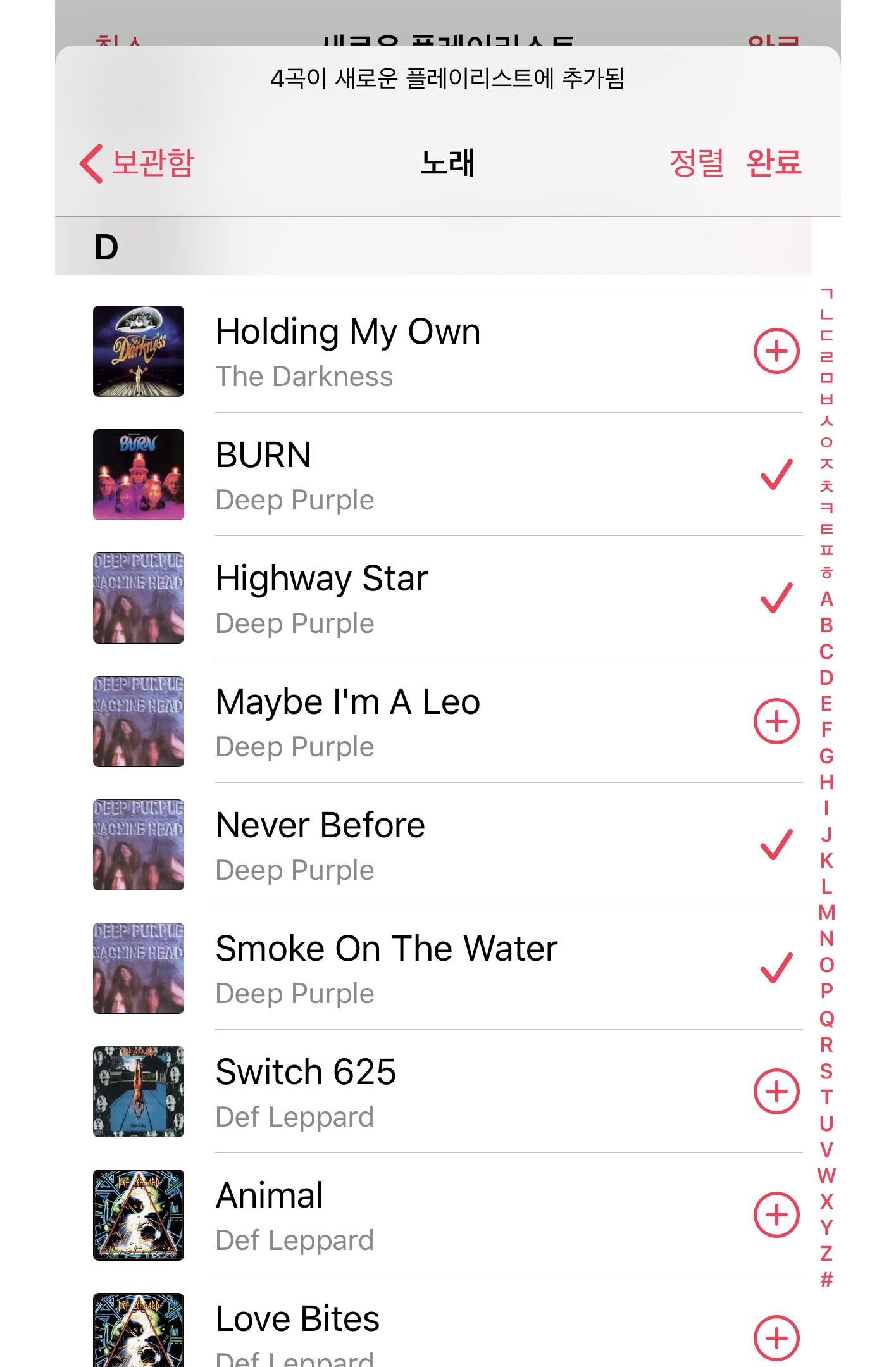 보관함에 있는 곡들 중 플레이리스트에 넣고 싶은 곡을 골라 넣습니다.