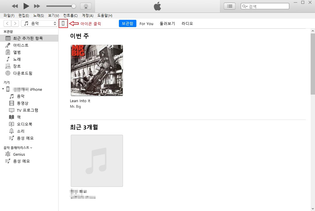 아이튠즈의 나의기기에서 음악 폴더안에 넣고자 하는 음악을 넣어주면 됩니다.