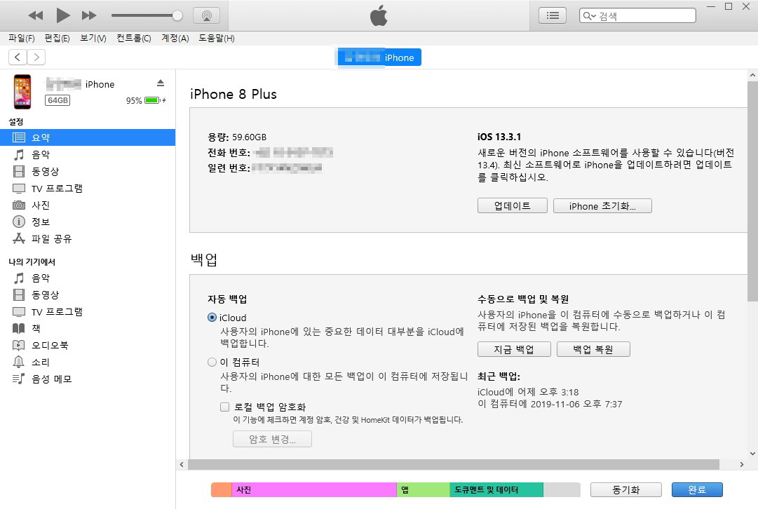 처음에 '수동으로 음악 및 비디오 관리' 체크하는 것만 잊지 말아주세요.