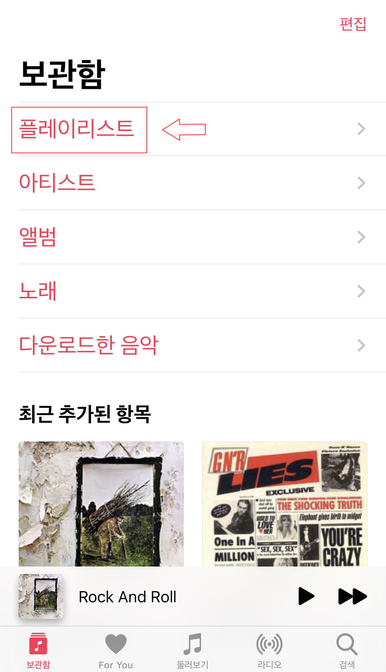 아이폰 음악 앱에서 플레이리스트를 눌러