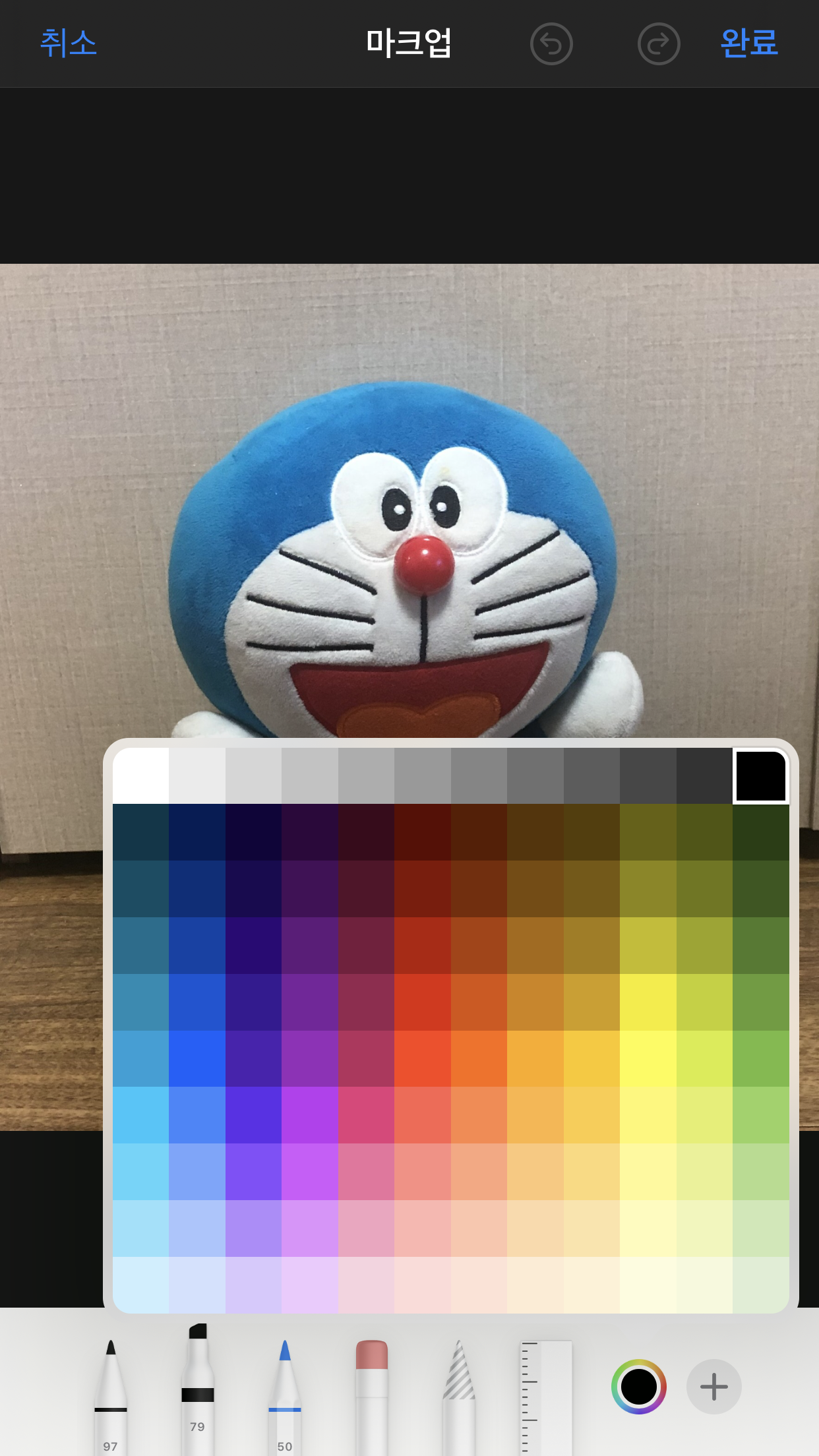 아래에 있는 펜 중 하나를 고르고 색깔도 선택할 수 있습니다.