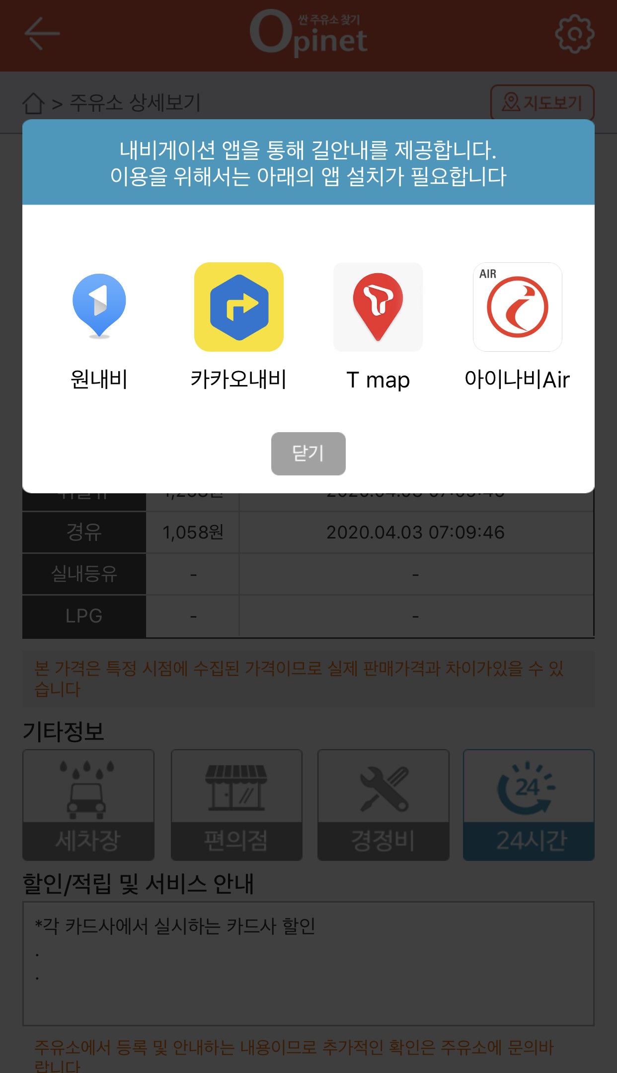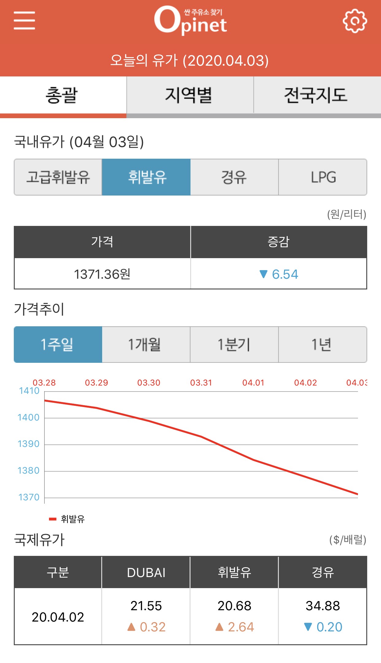 메인창에서 유가정보를 눌러 오늘의 유가 정보도 확인해 볼 수 있습니다.