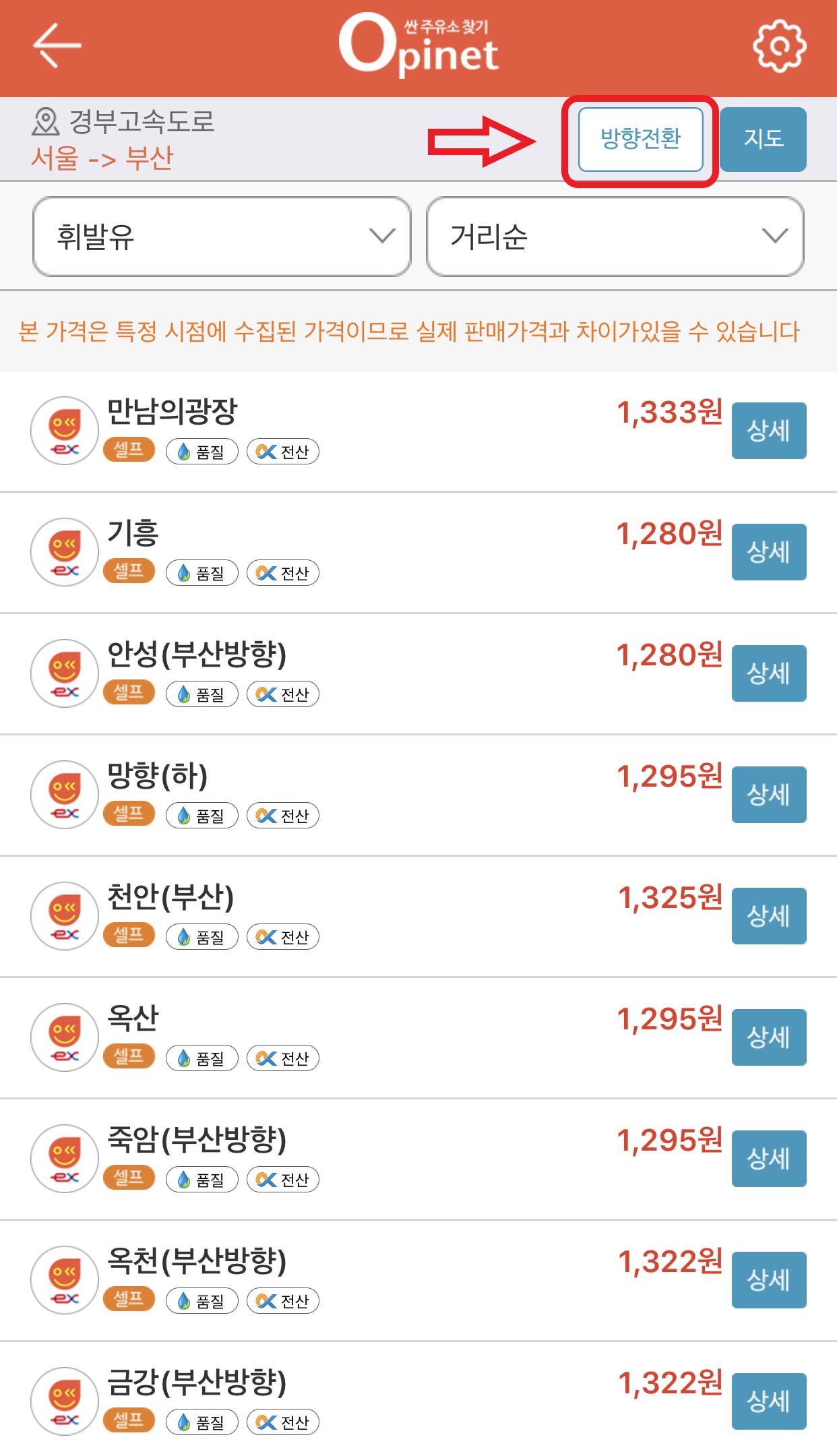 방향 전환 버튼이 있어 부산서 서울로 올라오는 경로에 있는 주유소 정보도 확인할 수가 있습니다.