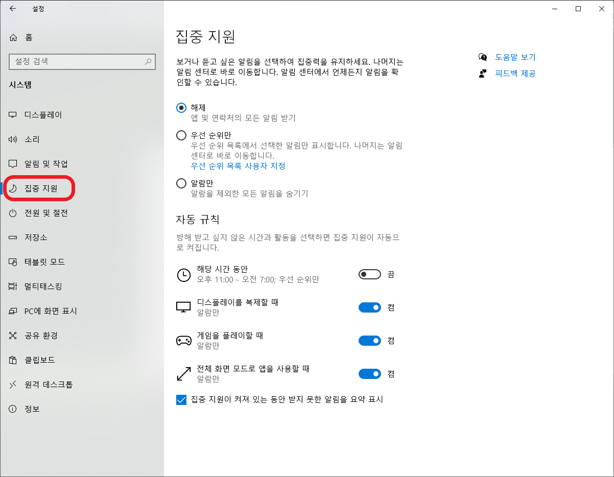 좌측 탭의 '집중 지원'을 눌러서 들어가면