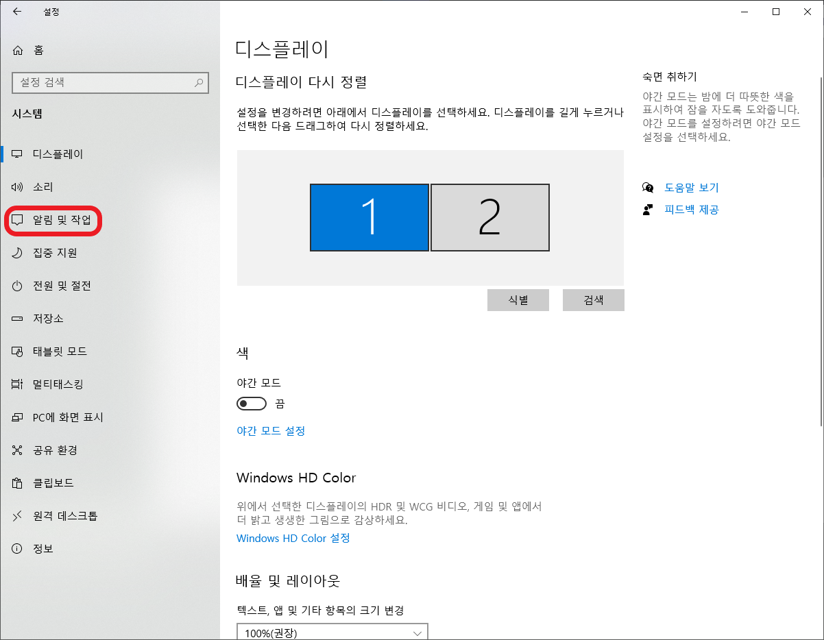 여기서 '알림 및 작업' 탭을 눌러주시면
