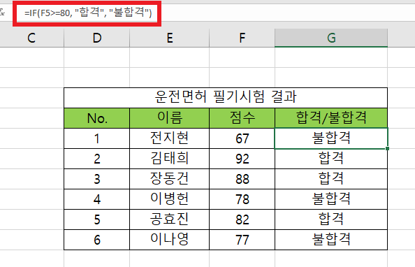 =IF(D5>=80, "합격", "불합격")