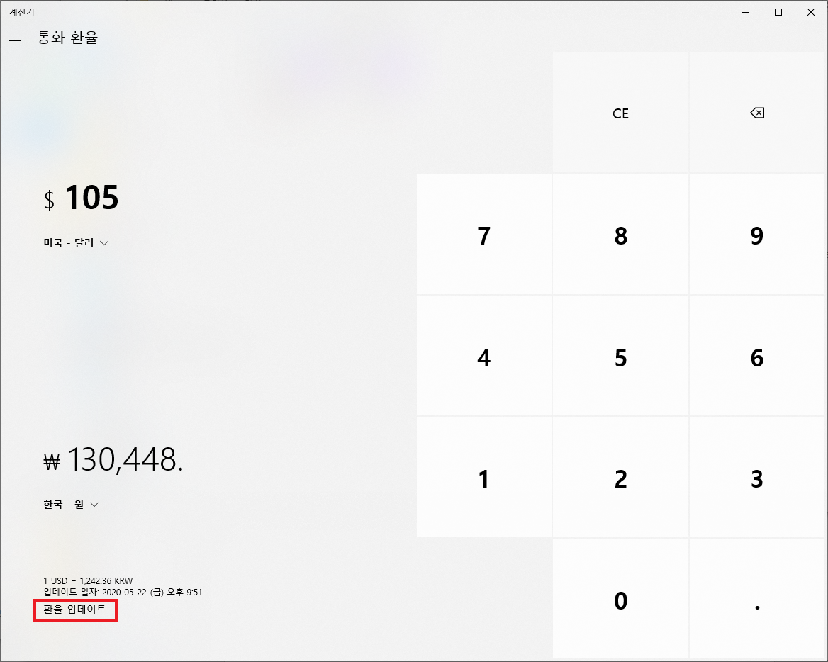 환율은 계속 바뀌기 때문에 알아볼 때마다 환율 업데이트를 해 주어야겠지요?