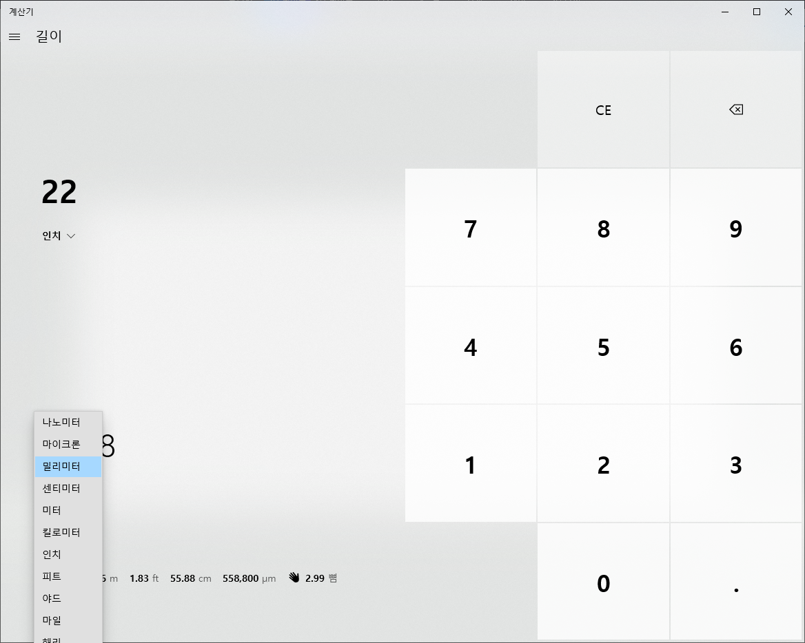 인치, 피트, 야드, 마일, 해리 등등 여러 가지 표현 가능한 치수들로 변환할 수 있습니다.