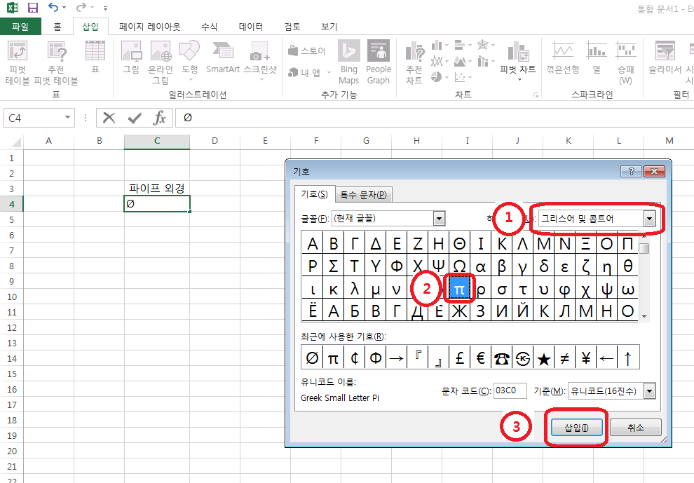 다만 하위집합에서 그리스어 및 콥트어를 선택하고 π를 찾아서 삽입을 눌러주면 끝입니다.