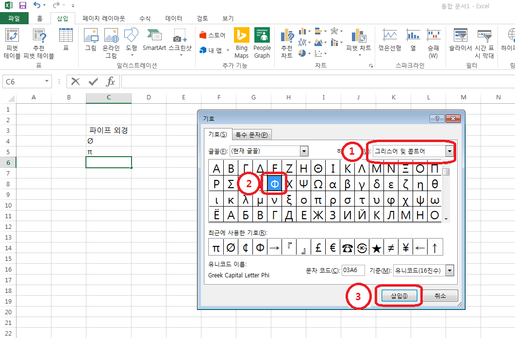 같은 방법으로 그리스어 및 콥트어에서 Φ를 찾아서 선택한 후 삽입을 누르면 됩니다.