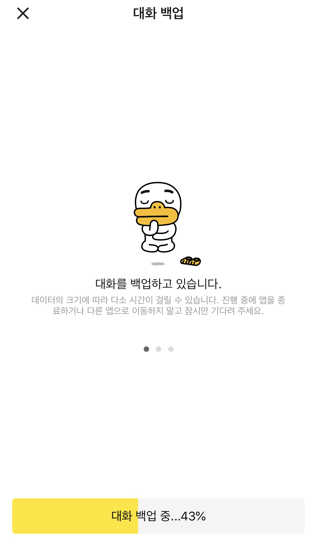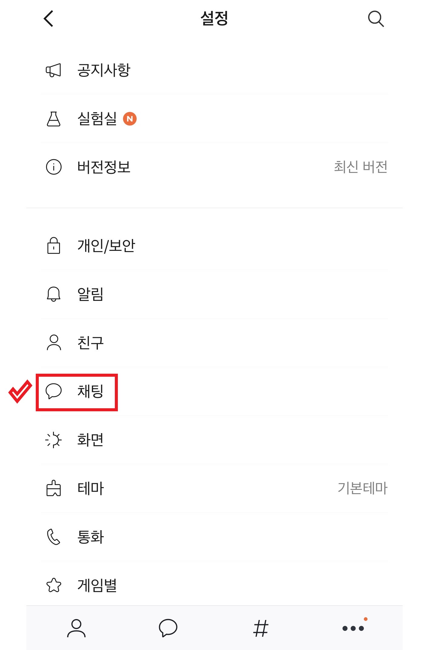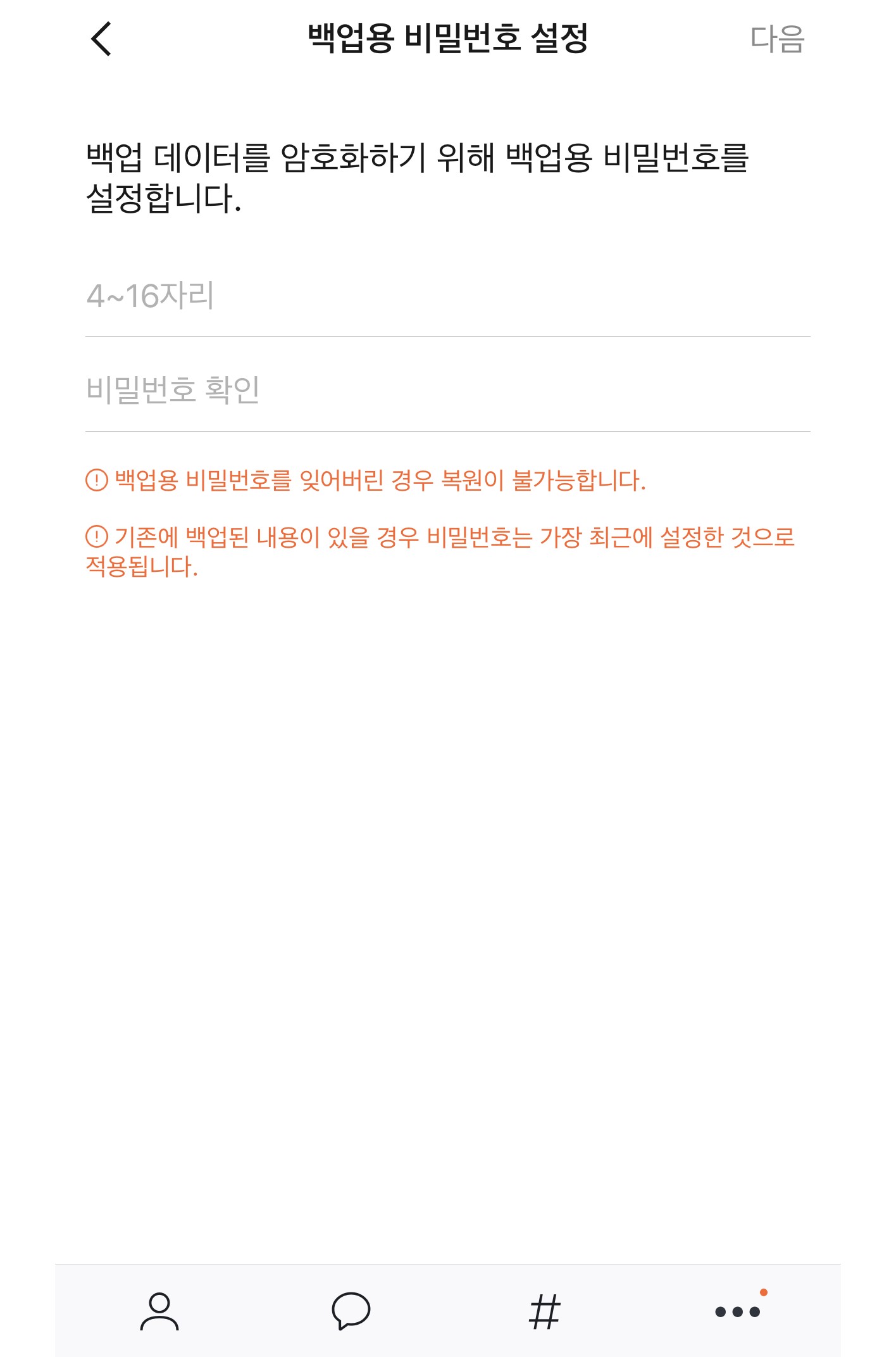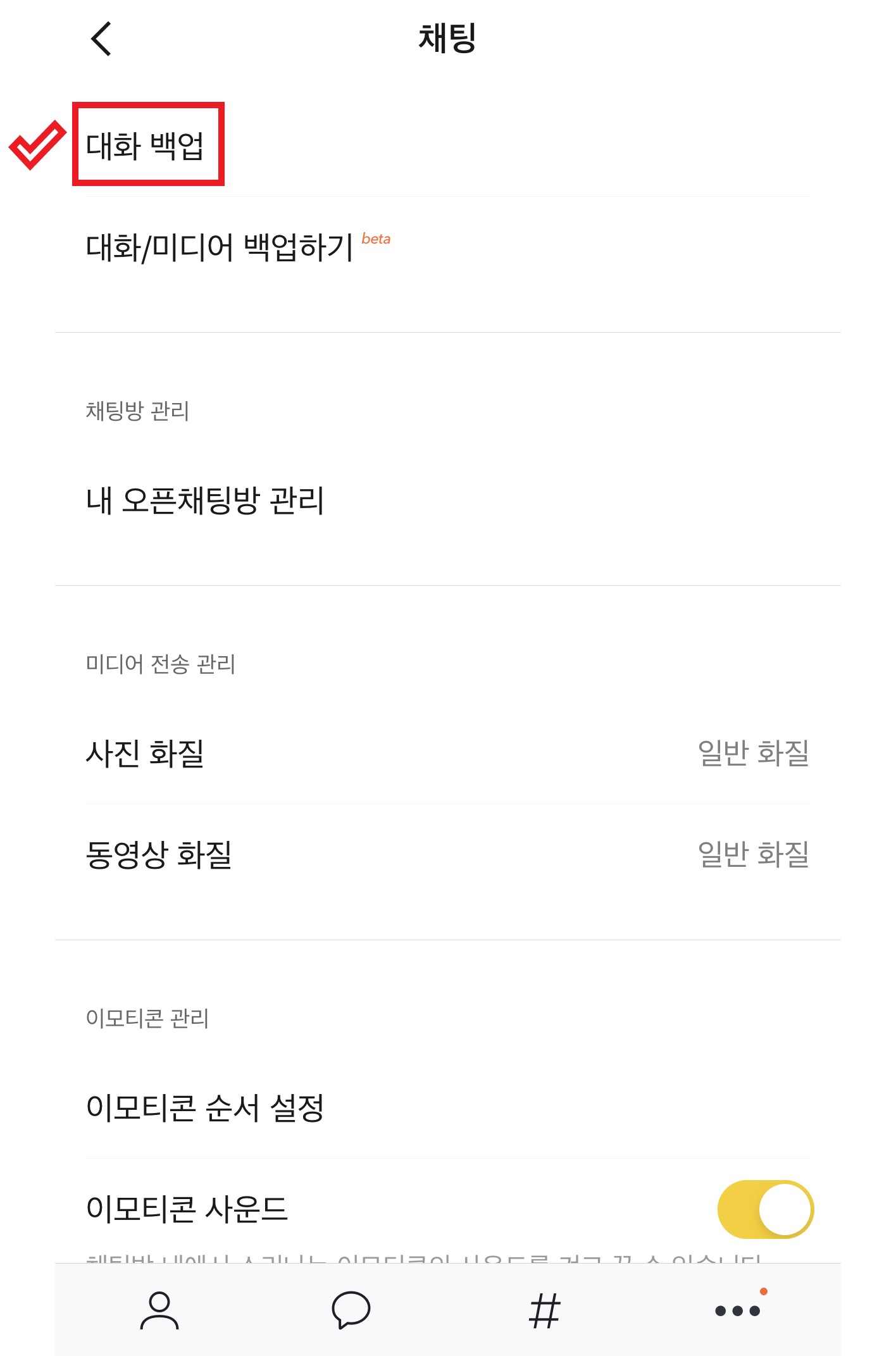 채팅 탭으로 들어가시면 제일 위에 대화 백업이라는 것이 보입니다.